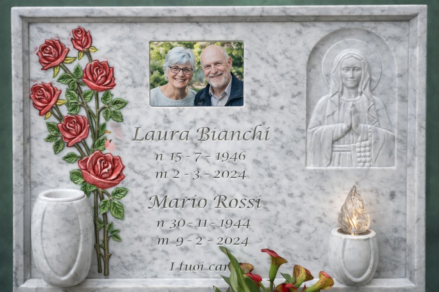 • Personalizzazione Totale: Ogni venatura del marmo è unica. Lavoriamo a stretto contatto con voi per scegliere caratteri, decorazioni in acciaio, bronzi e fotoceramiche.