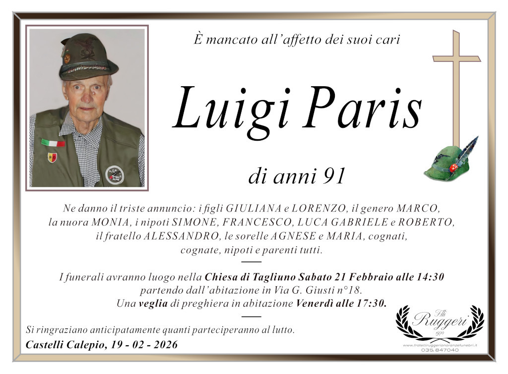 Il tuo pensiero sarà recapitato gratuitamente ai familiari di Luigi Paris scomparso all’età di 91 anni.